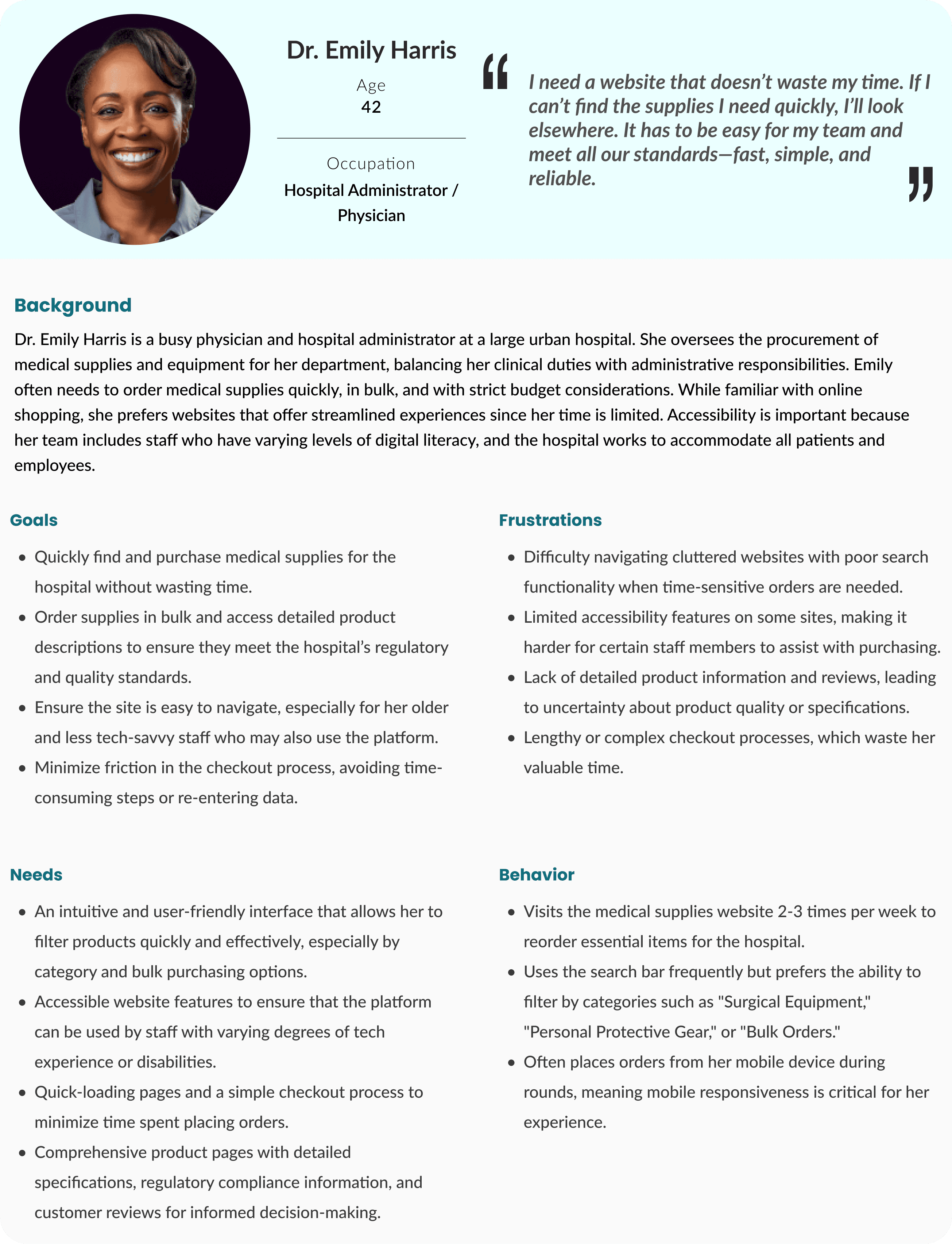 > To benchmark, I conducted an analysis of competitor sites. I explored how other medical supplies stores organized their catalogs, optimized their product pages, and handled accessibility, which gave me a clearer picture of industry standards.